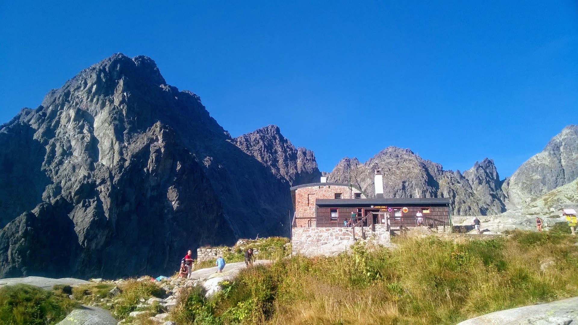 Schronisko górskie widziane ze szlaku. Tatry słowackie w słoneczny dzień.