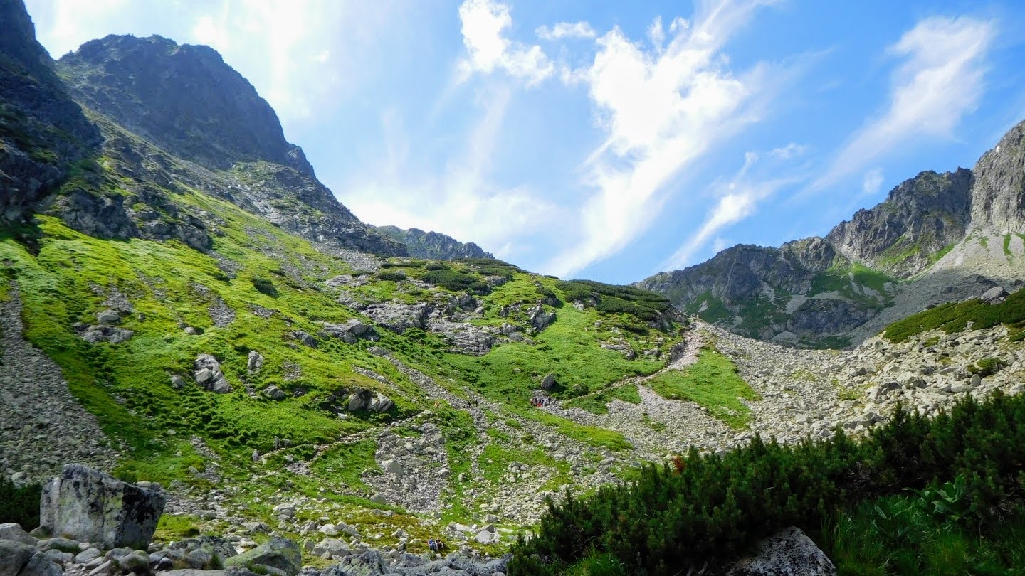 Wychodzimy niebieskim szlakiem, prowadzącym aż na sam Sławkowski Szczyt (2452 m n.p.m.). Droga jest dość monotonna, bez trudności technicznych, ale zapewnia bardzo ładne widoki. Jest to jedno z największych podejść w Tatrach – ponad 1400 m przewyższenia. Legenda głosi, że niegdyś Sławkowski był najwyższym szczytem Tatr i osiągał wysokość ponad 2700 m, ale rozpadł się w wyniku trzęsienia ziemi.  Schodzimy tym samym szlakiem i kierujemy się w stronę Hrebienoka. Ze Smokowca do Hrebienoka kursuje też kolejka, którą mniej zapaleni piechurzy mogą podjechać skracając sobie drogę.